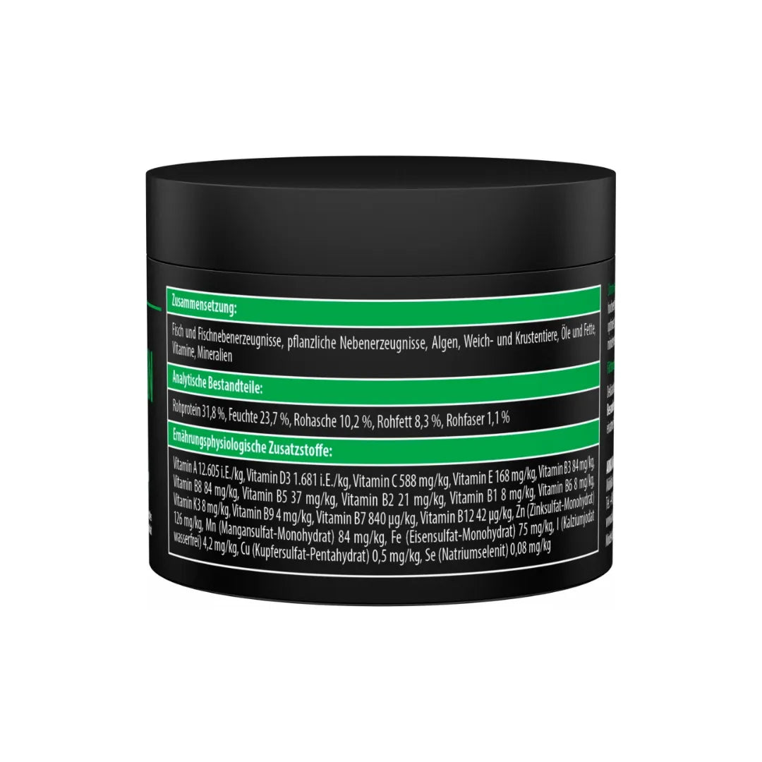 Zusammensetzung: Fisch und Fischnebenerzeugnisse, pflanzliche Nebenerzeugnisse, Algen, Weich- und Krustentiere, Öle und Fette, Mineralien, Vitamine