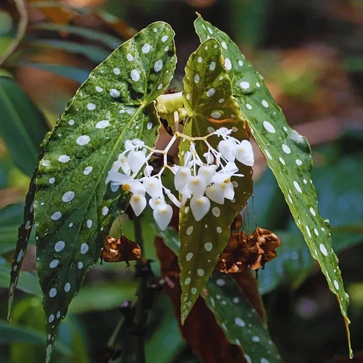 Ursprünglich stammt diese besondere Begonie aus den tropischen Regenwäldern Brasiliens und liebt entsprechend warme Temperaturen, hohe Luftfeuchtigkeit und indirektes Licht. Unter den richtigen Bedingungen kann sie sogar zarte, rosafarbene Blüten bilden, die sich wunderbar vom gepunkteten Laub abheben.