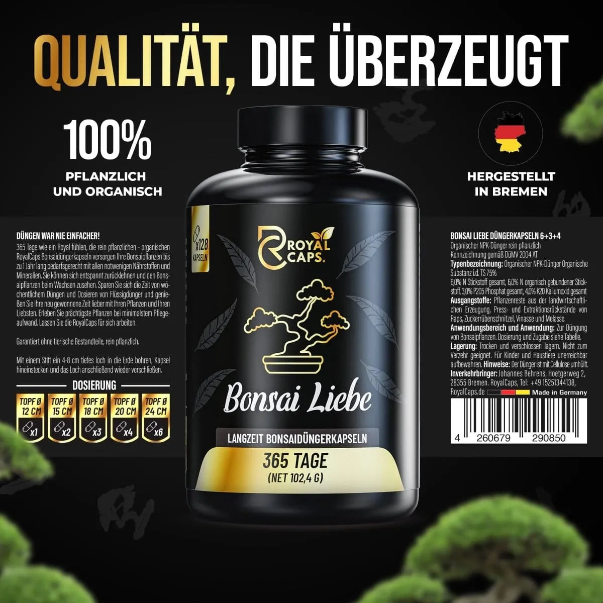 Mit Bonsai Liebe von Royal Caps versorgst du deine Bonsaibäume gezielt und langfristig mit allen notwendigen Nährstoffen – für volle 365 Tage. Die intelligenten Düngerkapseln enthalten eine exakt abgestimmte Rezeptur aus organischen Inhaltsstoffen, die langsam und bedarfsgerecht über das gesamte Jahr hinweg wirken – ohne wöchentliche Pflege oder kompliziertes Dosieren.