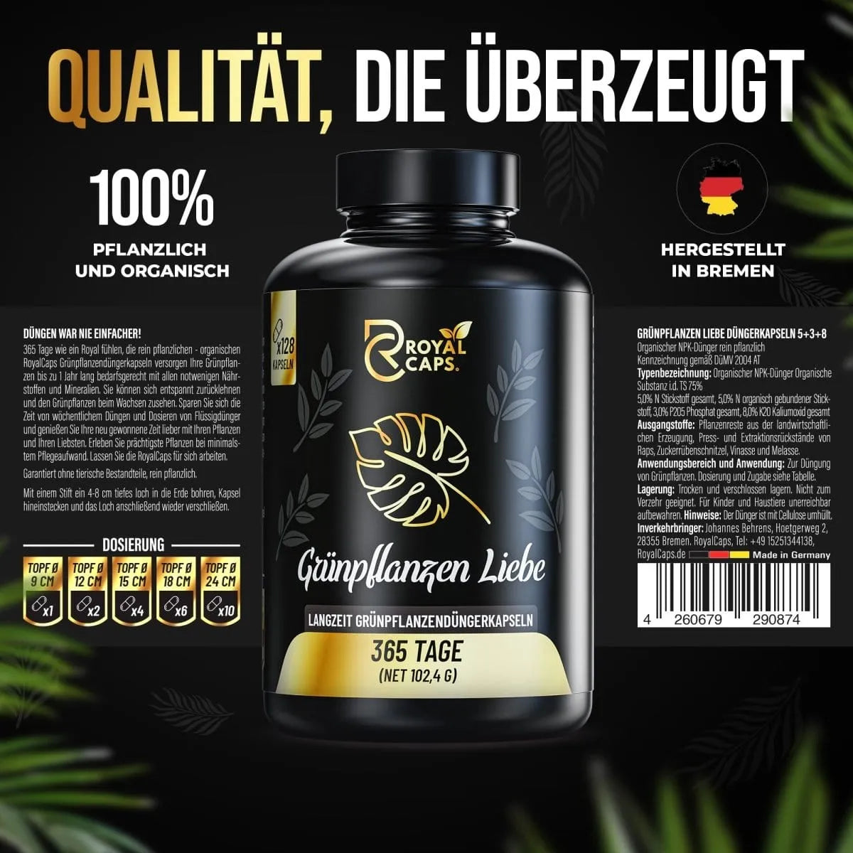 Schluss mit lästigem, wöchentlichem Nachdüngen! Mit Grünpflanzen Liebe von Royal Caps erhalten Ihre Zimmerpflanzen eine gleichmäßige, bedarfsgerechte Nährstoffversorgung für ein ganzes Jahr – mit nur einer Anwendung.